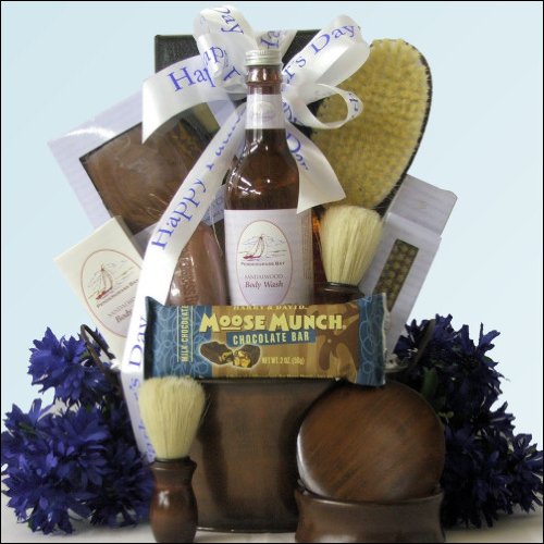 a little bit more expensive: this unique, masculine grooming gift basket for all his grooming needs. It includes a great selection of Men's Bath and Shaving Products as well as a 10-piece Manicure Grooming Set and a little gourmet treat - Harry & David's Milk Chocolate Moose Munch Bar